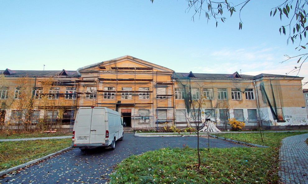Двухэтажное здание в сталинской стилистике было построено в 1932 году. До 1980-х внутри работала школа. В последнее время, по сведениям «Канонера», объект пустовал, окна были выбиты.