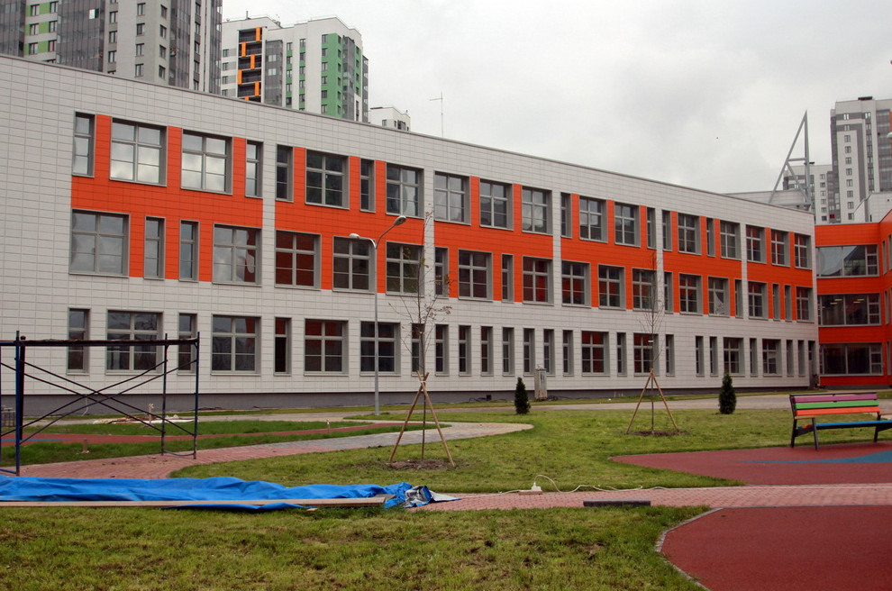 На Южном шоссе в новом жилом квартале завершилось строительство школы. Ее фасады выполнили в «стиле» хаотизм, а главным элементом стал острый угол, обращенный на запад.