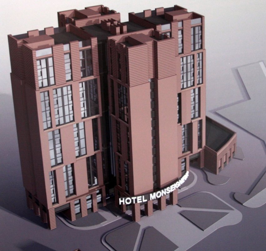 Теперь, по данным «Канонера», здесь решено построить трехзвездочную гостиницу на 500 мест, а скорее всего, апарт-отель. Заказчиком выступает ООО «Специализированный застройщик „Сакристия“», входящее в группу RBI. Проектом ООО «НПФ „Ретро“» предусмотрено 18-этажное здание, выполненное из четырех блоков, расставленных крестом.