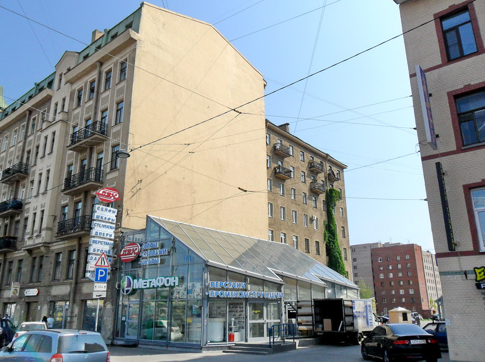 Здание-стекляшка стояла в лакуне между домами 130 и 138 по Лиговскому проспекту. Оно было построено в российское время, предположительно в начале 2000-х. В нем работали разные точки, в последнее время — цветочный магазин.