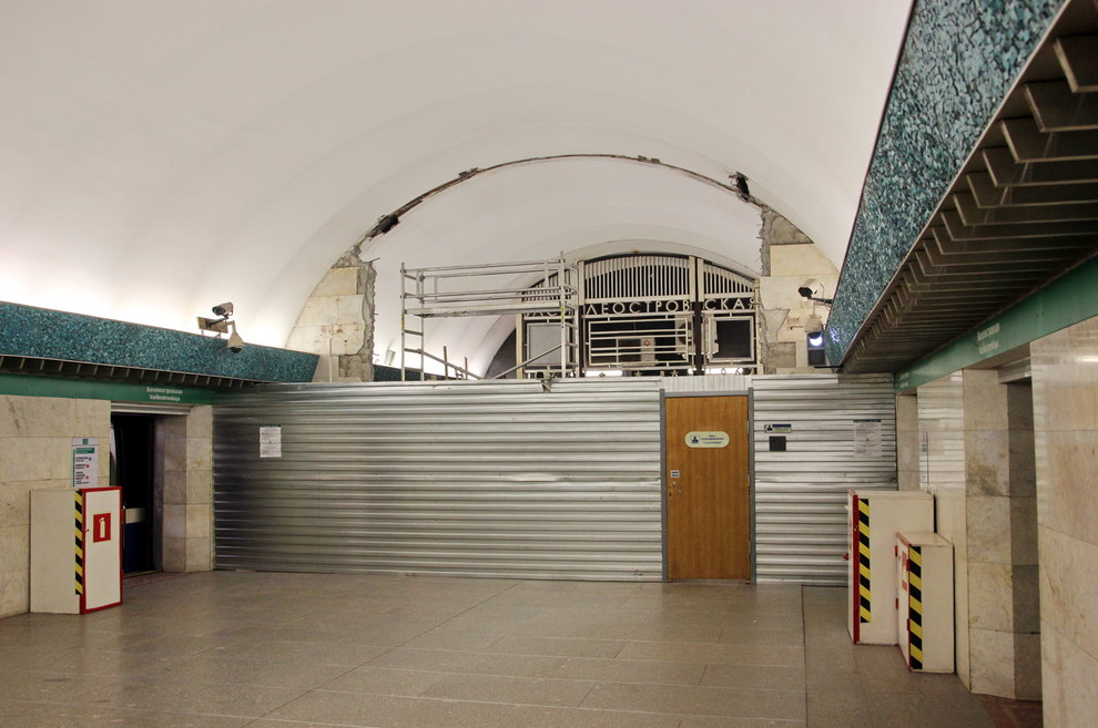Декоративная металлическая стенка в торце подземного зала закрывала собой техническое помещение для размещения оборудования блокпоста. Из-за этого нельзя было выйти из двух дверей первого вагона в сторону «Приморской» и двух дверей последнего вагона в сторону «Гостиного двора».