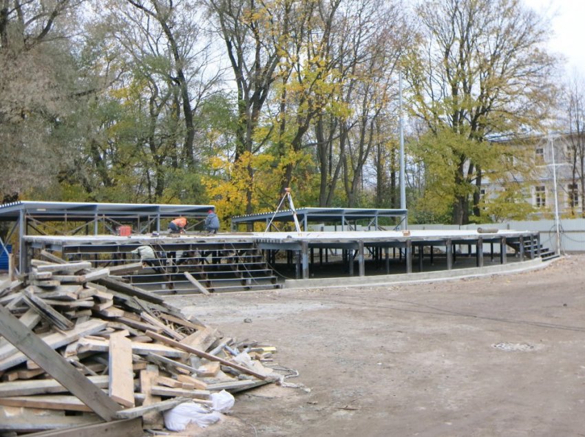 Завершить работы должны к концу нынешнего года. Сейчас возводятся конструкции эстрады. Добавим, что в 2015 году дирекция парка возвела еще одну современную эстраду; для этого отгородили кусок зеленой зоны возле бывшей Центральной аллеи.