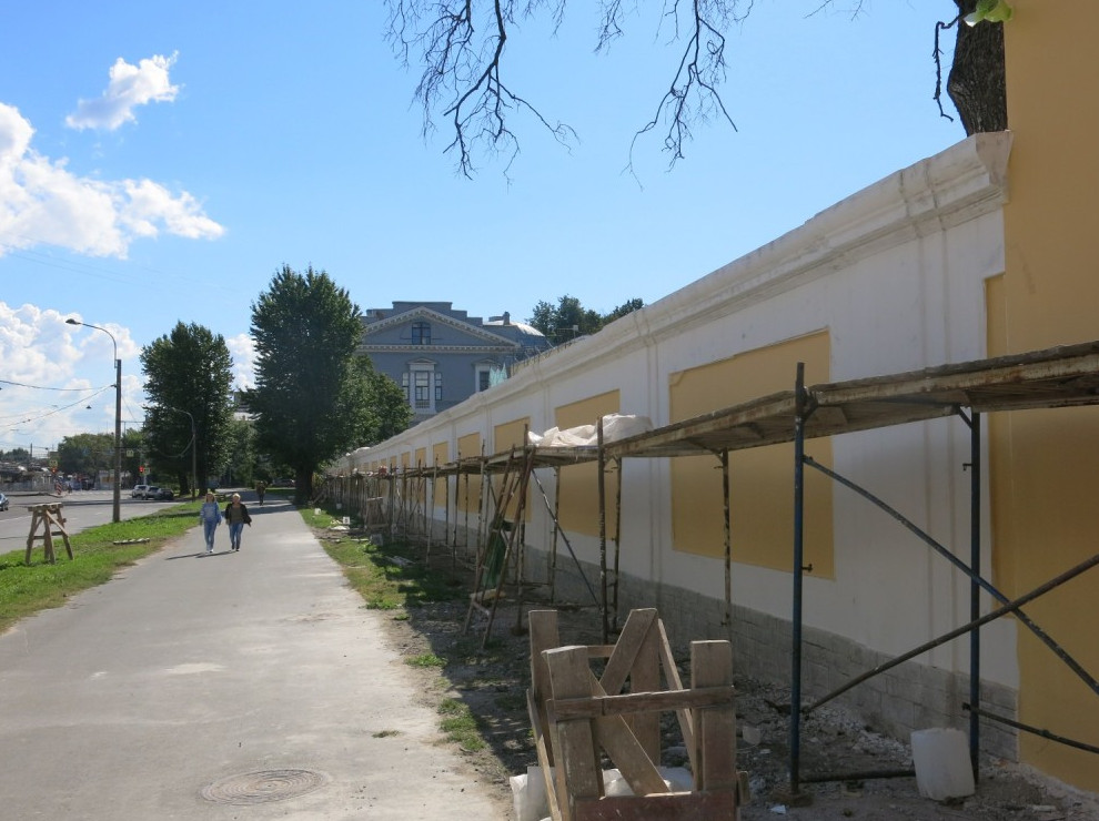 Тем не менее неохраняемую ограду тоже восстановили в прежнем виде. Она представляет собой пенобетонную стену, окрашенную в белые и желтые цвета (ранее она была шлакобетонной). Работы проводило ООО «Гранд».