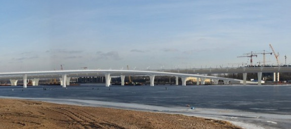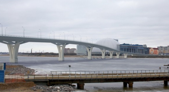 Пешеходный мост длиной в полкилометра от Яхтенной улицы к стадиону на Крестовском острове не защитят от ветра. Ранее планировалось построить закрытую переправу, совмещенную с магазином.