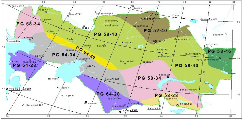 Согласно климатической карте, действующей еще со времен СССР, у нас присутствует 3 климатических зоны: в основном, четвертая, пятая и немного третьей. Но сегодня идет работа по более узкому разделению страны на климатические зоны. Например, на самом востоке страны критическая температура покрытия может достигать минус 46 градусов, на севере – минус 40. А на самом юге, в частности, в Шымкенте, расчетная температура покрытия может составлять плюс 64 градуса. Но были случаи, когда оно и до плюс 75 там нагревалось. То есть, «вилка» крайне внушительная.