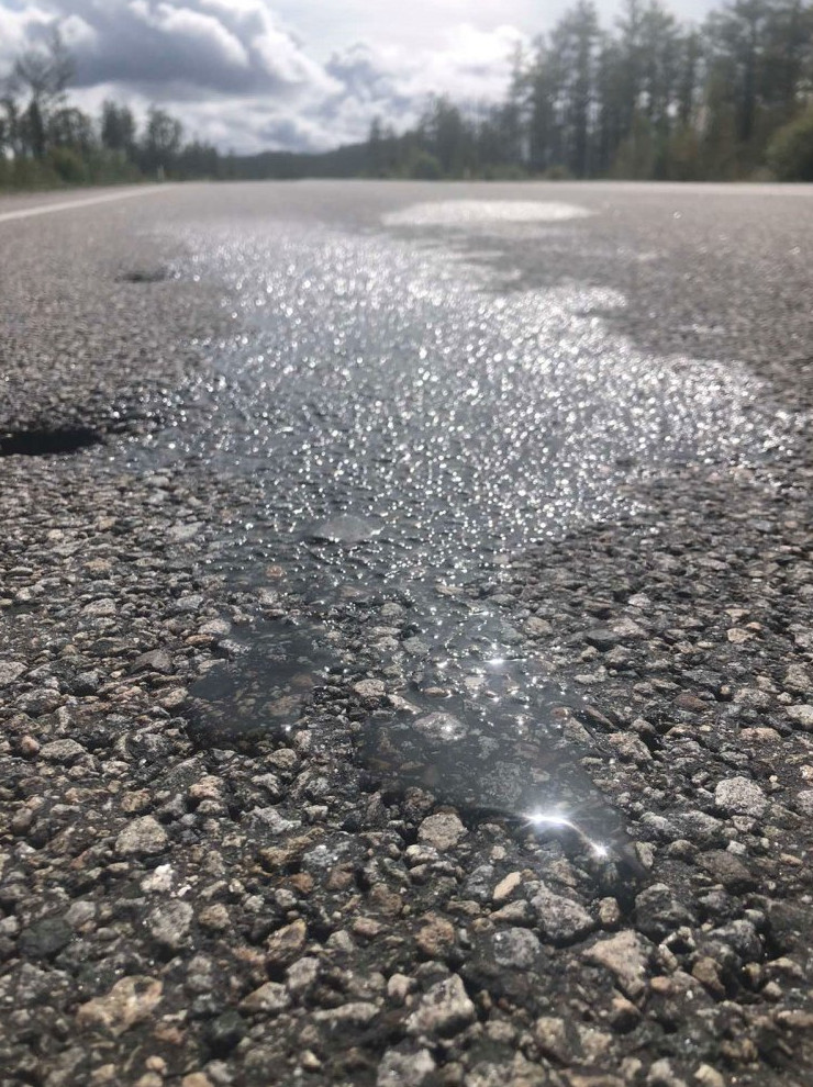 А, например, для автодороги «Амур» характерен вид деформации, при котором весной, в период таяния снега, идет дренирование сквозь дорожные одежды. Как известно, асфальтобетон не является абсолютно плотным материалом. Он имеет сообщающиеся друг с другом воздушные поры. По этим порам вода, под давлением снизу, легко просачивается на поверхность дороги. Получается, удивительная ситуация: дождя нет, а лужи на дороге есть.