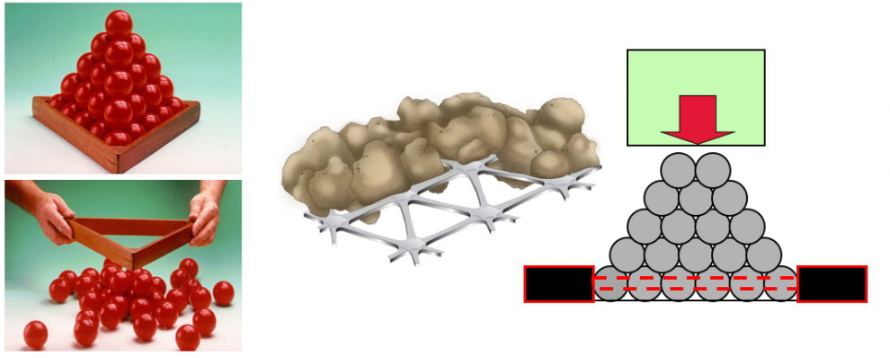 Шары сами между собой не имеют никакого сцепления, как и щебень в конструкции, где шары — это частицы инертного материала, а бильярдный треугольник является георешеткой. Без фиксации треугольником шары разъезжаются. А заклиненные треугольником они могут сложиться в пирамиду и нести вертикальную нагрузку. На практике такие пирамидки возникают в каждой из ячеек георешеток, ограничивая горизонтальное перемещение частиц. Происходит мультипликация данного эффекта, последующая заклинка передается на вышележащие слои. Сочетание георешетки и заполнителя образует композитный слой с повышенными характеристиками или механически стабилизированный слой. Данный слой эквивалентен слою без георешетки с толщиной, увеличенной, в среднем, на 40%.