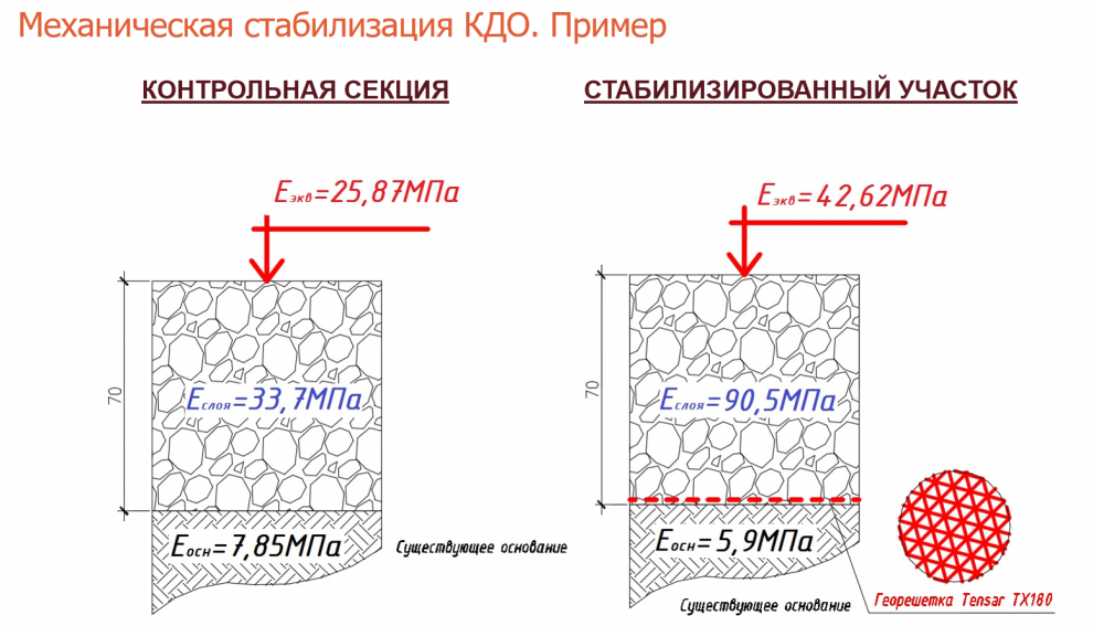 Эффект механической стабилизации выражается в продлении срока службы дорожной конструкции, повышении эксплуатационной надежности, а также в возможности экономии на уменьшении конструктивного слоя дорожной одежды без потери ее качества.