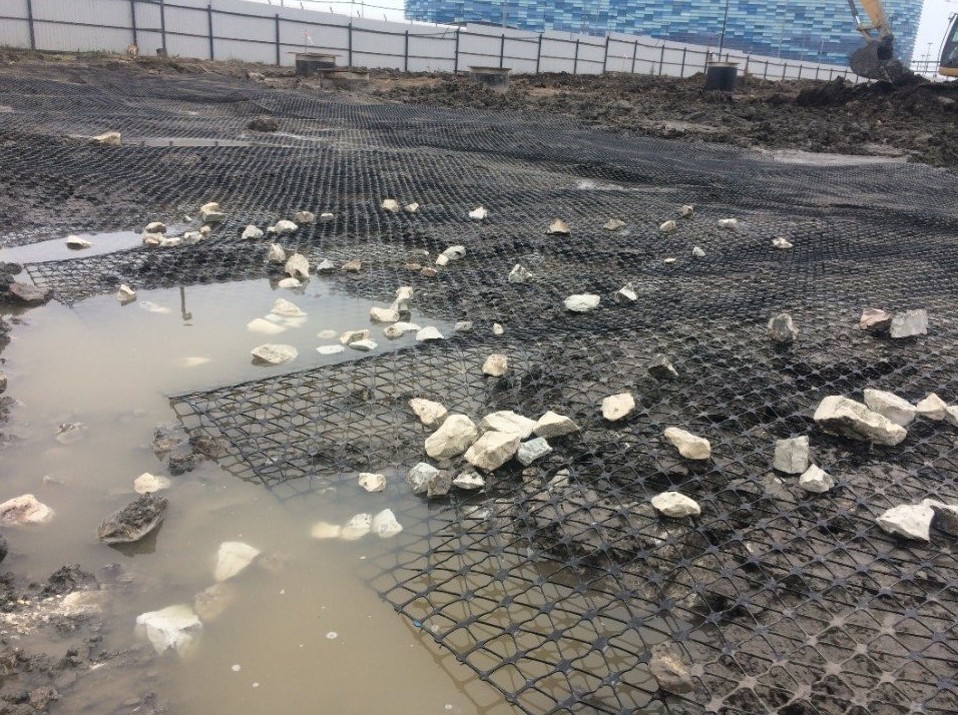 Рис. 3. Пример использования георешетки при строительстве на слабых основаниях (Центр художественной гимнастики в Сочи)