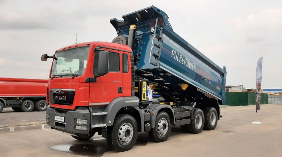 Не так давно на российском рынке появился дорожный самосвал MAN TGS 41.440 8x4 с самосвальным кузовом от калининградской компании Grünwald. Технически допустимая полная масса одиночного самосвала 41 т, в составе автопоезда – до 80 т. Большое внимание уделено обеспечению устойчивости самосвала – центр тяжести расположен низко, все 4 моста оснащены стабилизаторами поперечной устойчивости, дополнительный стабилизатор установлен на кузове.