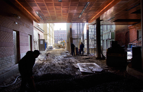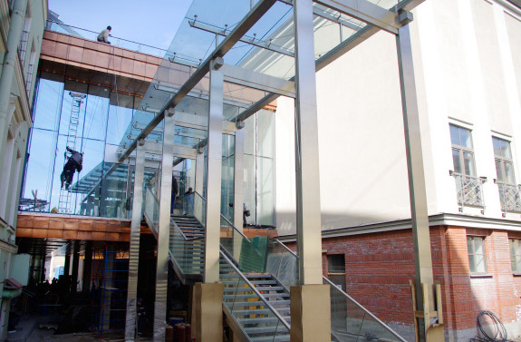 По словам заместителя департамента строительства «Модуля Т» Дмитрия Точеных, вторую сцену сдадут 25 апреля. Сейчас подрядчик проводит пусконаладочные работы, вывозит строительный мусор и вспомогательные конструкции. В ходе строительства были заменены фундаменты здания, усилены стены и проведены корректировки нагрузки на несущие конструкции. На площадке работали 78 субподрядных компаний. Генподрядчиком выступило ОАО «Генеральная строительная корпорация». Господин Точеных отметил, что во время возведения сложнее всего было разместить на небольшом внутридворовом пространстве строительную технику.