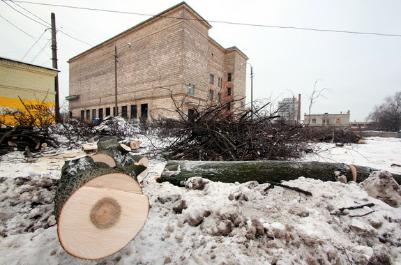 В 2010 году часть сквера «Спутник», принадлежащая сейчас структурам «Конрада» (от улицы Бабушкина до туалета), была исключена из реестра зеленых зон общего пользования. 8 января этого года началась подготовка площадки. Тогда на участке начали сносить деревья.