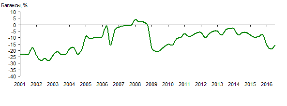 К позитивным моментам, выявленным в III квартале 2016 г., можно отнести возросшую на 1 п. п. по сравнению со II кварталом среднюю загрузку мощностей — 62%. Кроме того, замедлились темпы роста цен как на строительные материалы, так и на подрядные услуги строительных организаций. Снизились инфляционные ожидания на ближайший квартал, сохранилась положительная динамика изменения прибыли строительных организаций.