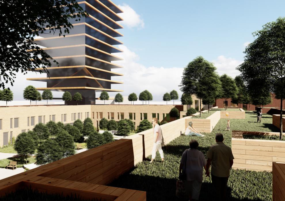 Верх стилобатной части можно превратить в эксплуатируемую крышу, обильно озелененную. Доступ туда будет и с верхних, и с нижних этажей. Точно также будет общедоступным и двор, оснащенный разными активностями для детей и взрослых. Это обеспечивает равный доступ к комфортному общедомовому пространству.