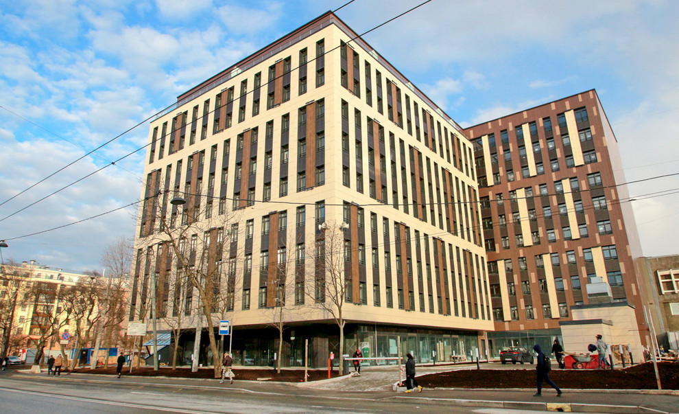 На Малом проспекте Васильевского острова, 54, корпус 2, завершилось строительство апарт-отеля. Он расположился на месте сталинского здания школы и сквера перед ней.