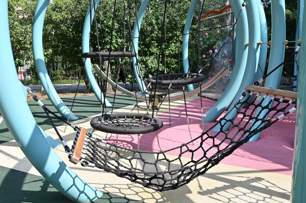 Футуристические “щупальца” игрового комплекса - не только эффектная стилизация, но и отсылка к модному биодизайну. На конструктивной основе крепятся многочисленные гамаки, качели-гнезда, веревочные элементы и даже скалодром. «Зеленая» тема раскрыта и в современном проекте “Оливки” в парке Филатов луг. Игровая площадка стилизована под оливковое дерево, чья высота достигает 10 м.