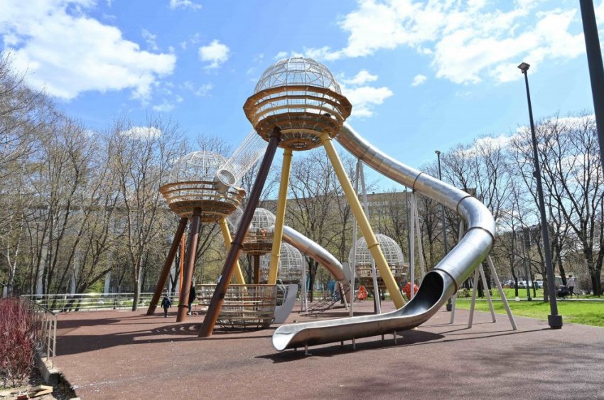 Пожалуй, один из самых эффектных проектов появился в начале 2022 г. в Семеновском сквере Москвы. Это игровой комплекс “Атомы”, он создан по индивидуальному дизайн-проекту для тематического паркового пространства “Химия”. По задумке дизайнеров “Новых Горизонтов,” визуальная доминанта конструкции – 5 больших шаров-атомов. Они смонтированы на разной высоте и соединенных между собой “кристаллической решеткой” – металлическими переходами. Архитектурное решение позволяет детям беспрепятственно передвигаться по всему игровому комплексу, не спускаясь на землю. Площадь такого объекта – 250 кв. метров, а высота – почти 10!