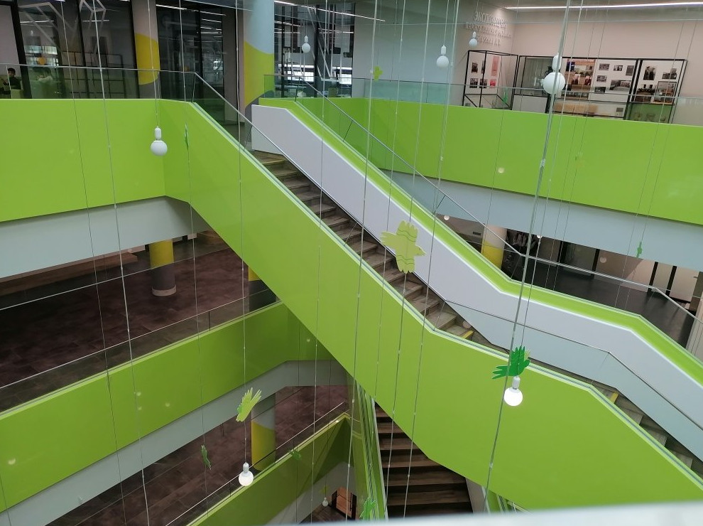 Всюду в школе присутствует жизнеутверждающий зеленый – причем, не открытый и однотонный, а градиентный, деликатно переходящий от светлосалатового к темно-зеленому. Как будто символизирующий начало пути к знаниям (цвет молодой зелени), постепенное их накапливание и, наконец, как результат – получение высококлассного образования (насыщенный зеленый).