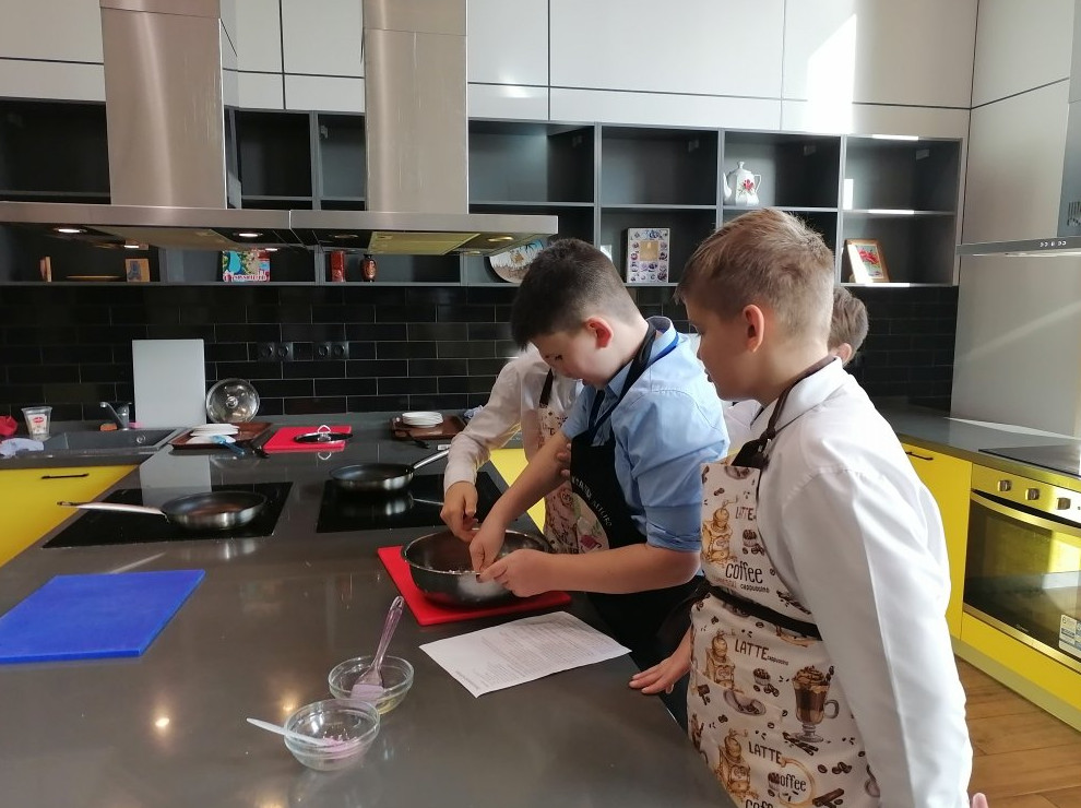 -...У нас 8 жарочных шкафов, таким образом, каждый может попробовать приготовить что-то свое, - поясняет директор. - Каждая команда готовит по технологической карте. Причем девочки и мальчики готовят вместе...Мы тут как-то снимали видео, как младшие школьники готовили, дурачились – получился очень веселый и смешной сюжет.