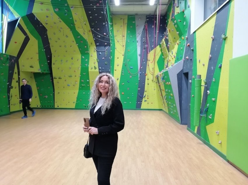 Автор проекта Анна Хакимова на фоне школьного скалодрома, решенного в любимых зелено-желтых тонах