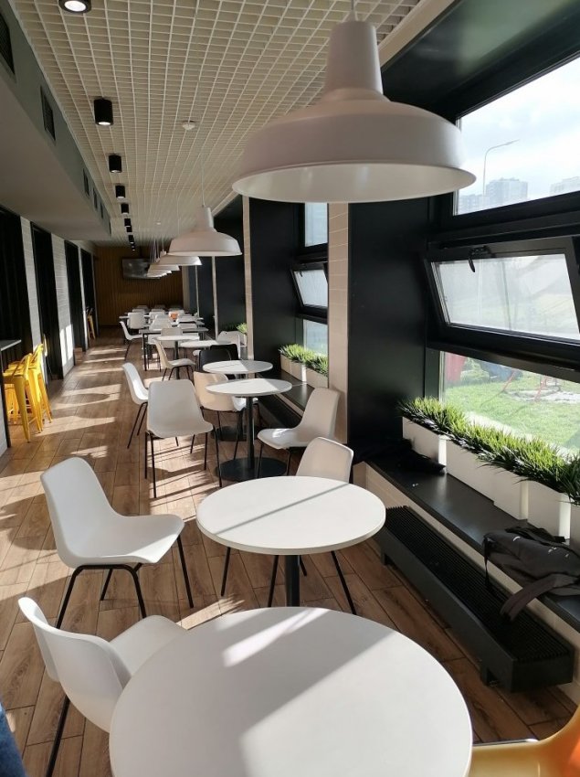 - Обратите внимание, - останавливает наше внимание Анна Хакимова. - Раньше это были окна на улицу, а сейчас здесь появилась симпатичная терраса со столиками – здесь дети тоже могут устроиться и перекусить.