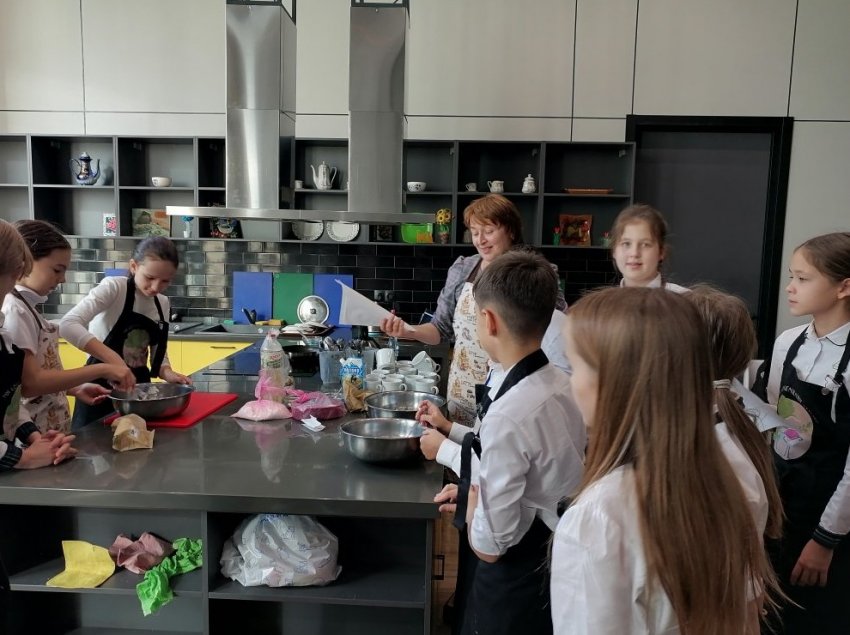 Но на этом питательная эпопея не заканчивается. К столовой примыкает школьный Кулинариум, где ребята колдуют над блюдами собственного приготовления – в рамках часов по трудовому обучению.