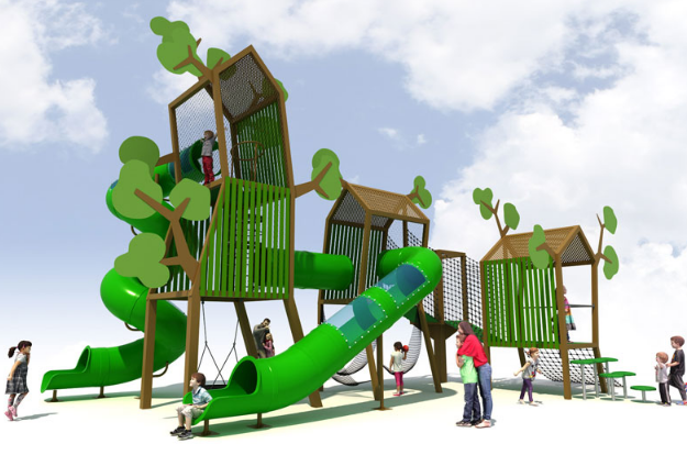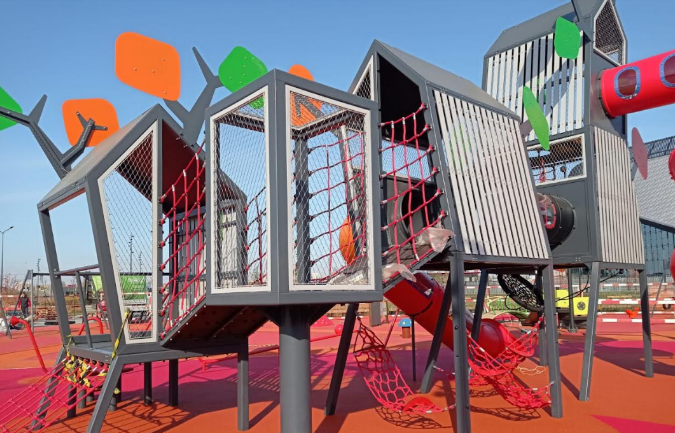 В московском Сиреневом саду открылась новая дизайнерская детская площадка с игровым комплексом “Танцующие домики” от компании “Новые Горизонты”. Замысел проектировщиков – слить воедино стилистику большого города, модерн и «экологичность». Так, комплекс состоит из трех игровых башен, украшенных стильными кронами деревьев и оборудованных плетеными гамаками, веревочными лестницами, качелями и скоростными винтовыми горками. Дети могут передвигаться между башнями благодаря сетчатым тоннелям, не спускаясь на землю.