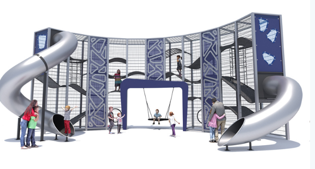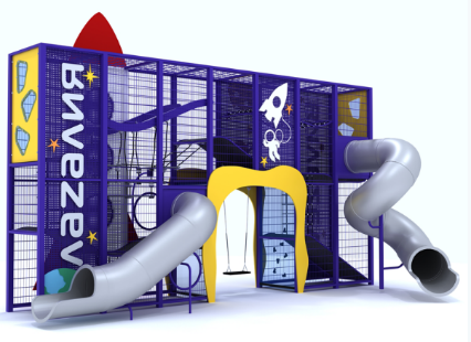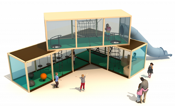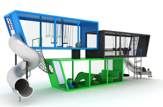 Другой проект - “Стройка”. Конструкция этих игровых комплексов уникальна и состоит из модулей, стилизованных под строительные контейнеры, поставленные друг на друга и соединенные между собой лазами, переходами. Игровая площадка может формироваться из любого количества модулей и обеспечивает большое игровое пространство при относительно малой занимаемой площади. "Стройка" исключительно комфортна для игр благодаря своей всепогодной конструкции: модули имеют крышу, а стены выполнены из прочного прозрачного поликарбоната, который обеспечивает прекрасный обзор и защищает от непогоды.