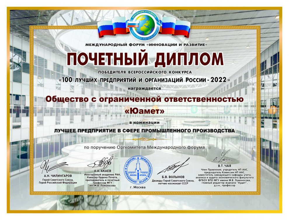 Является победителем всероссийского конкурса «100 лучших предприятий и организаций России - 2022» в номинации «Лучшее предприятие в сфере промышленного производства».