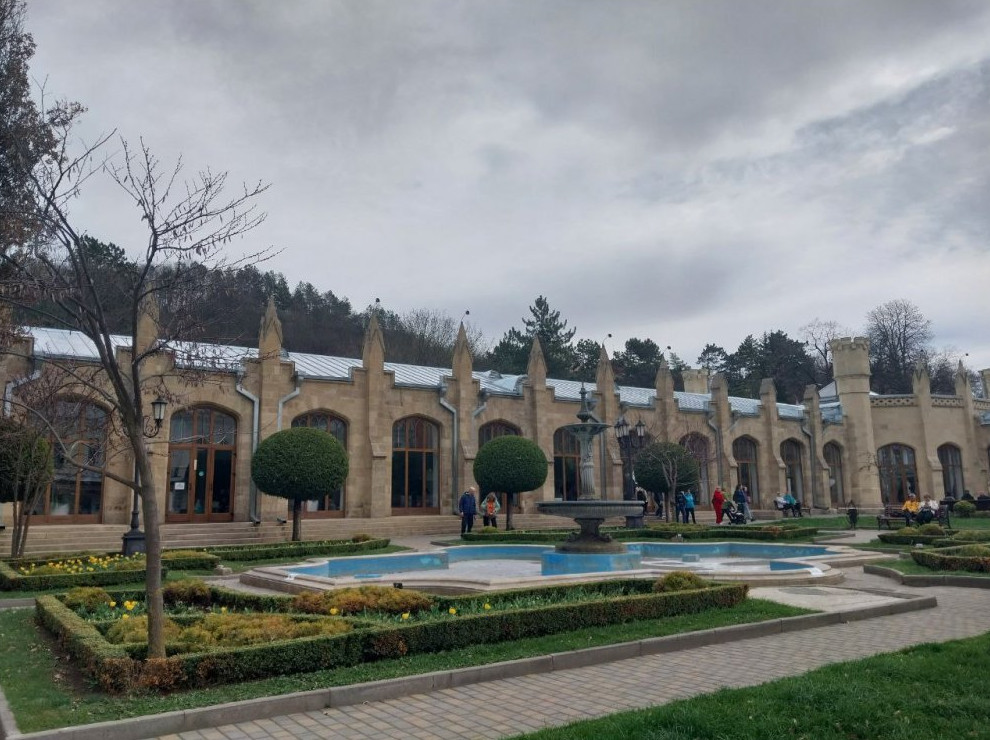 Фонтан "Лягушки" с Нарзанной галереей на заднем плане. В систему фонтана пока не запустили воду - готовят к летнему сезону