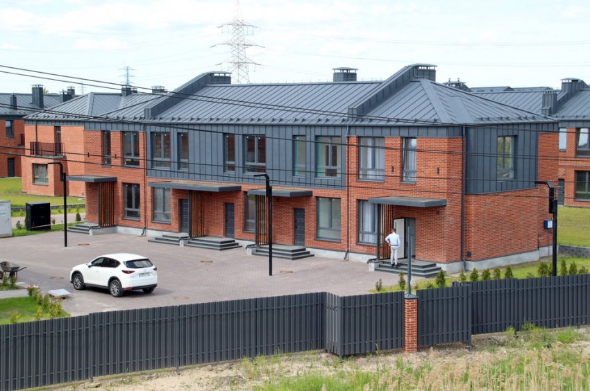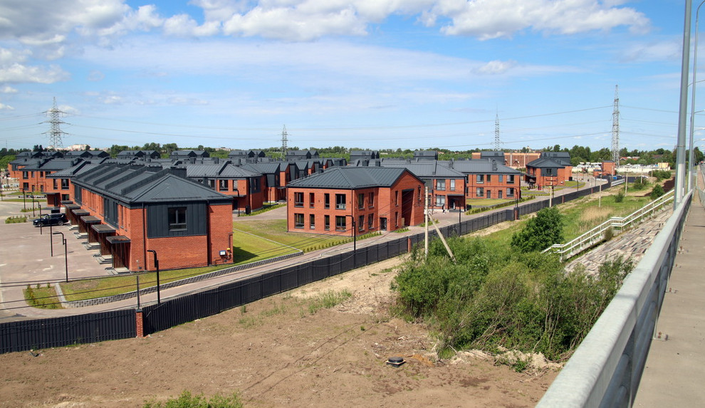 На Красносельском шоссе возле Сергиевского путепровода в Стрельне завершилось строительство комплекса таунхаусов. Он расположился на месте бывших совхозных пашен.