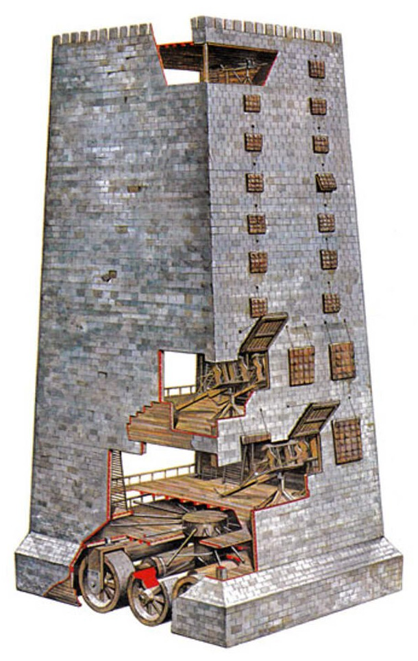 Девятиэтажная башня заканчивалась штурмовой площадкой в 9 м. Впрочем вести огонь можно было не только оттуда – на всех этажах размещались порты с механическими заслонками и отличной защитой от огненных стрел. На каждом уровне сооружения проходило две лестницы – одна на подъем, другая на спуск. Башню приводили в движение 3 400 человек.