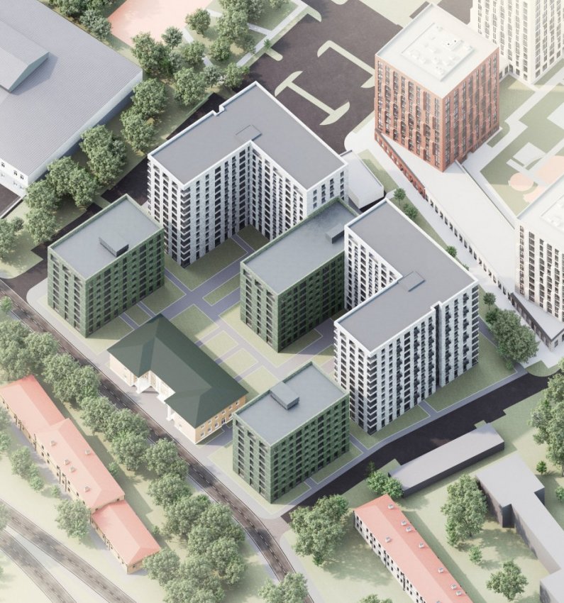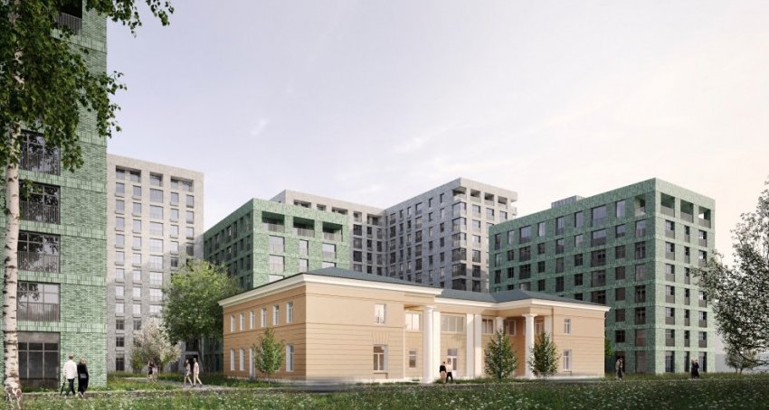 Двухэтажную «сталинку» Института радиоаппаратуры на Шкиперском протоке, 19, обстроят жилым домом. Он будет выполнен из многоэтажных коробок зеленого и серого цветов.
