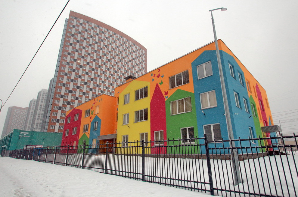 В том же месяце рядом появился детский сад на 150 мест. Трехэтажная коробка вместо элементов архитектуры получила яркую расцветку, напоминающую схематичное изображение карандашиков и птичек. Зданию присвоен адрес: Брюлловская улица, 1.