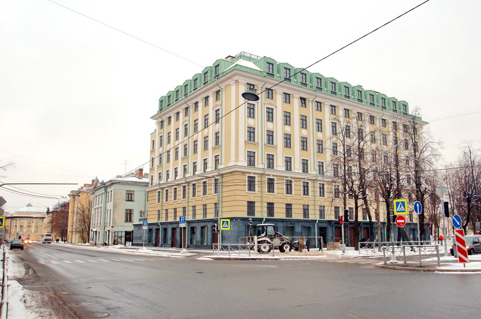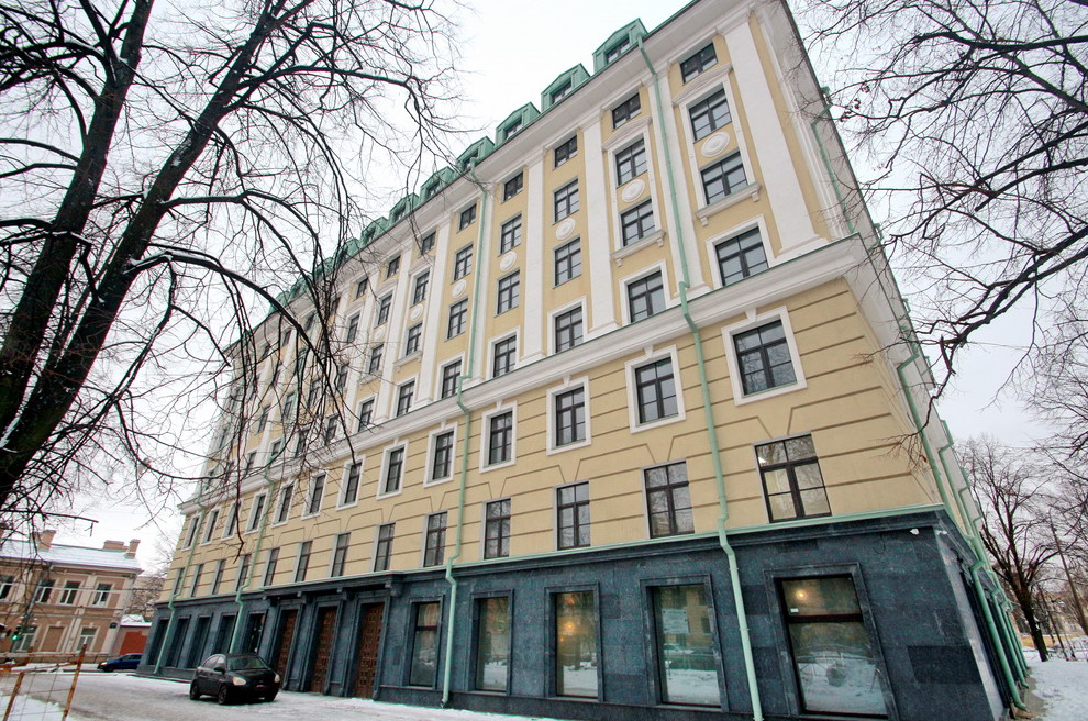В конце минувшего декабря объект ввели в эксплуатацию. В Подъездной переулок и на улицу Марата здание вышло семью основными этажами и одноэтажной мансардой. Определенные намеки на утраченную «сталинку» есть: пилястры, рустовка первых этажей, колер, карнизы. Заметим: закон воссоздания не требовал.