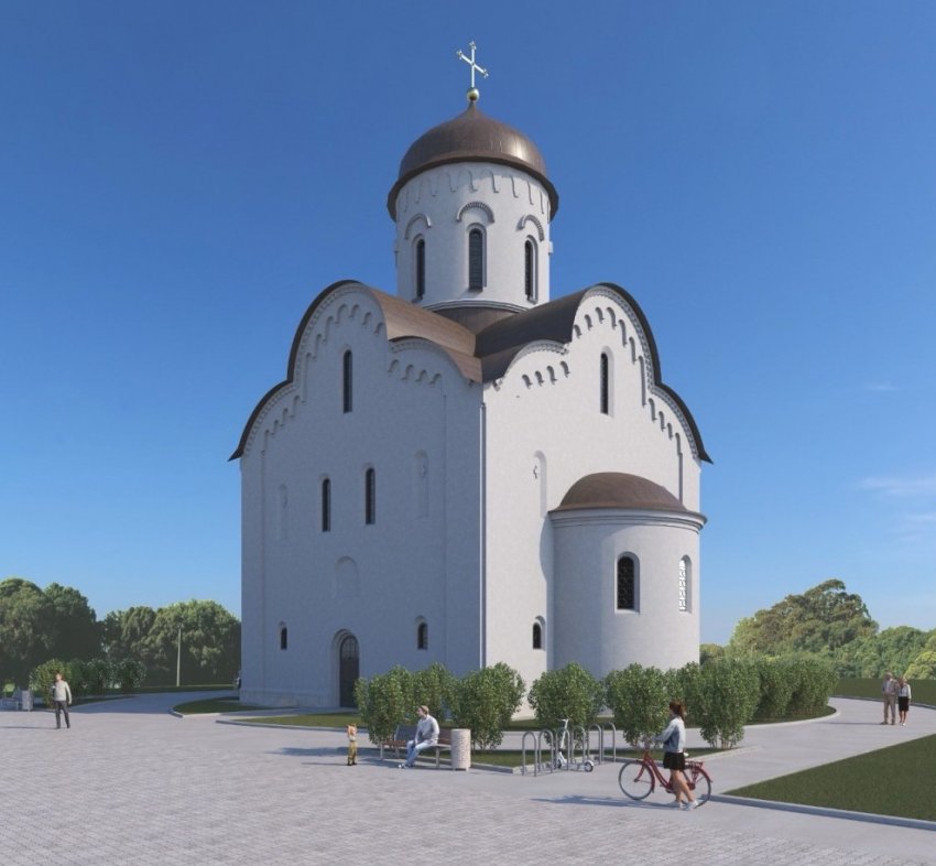 «Храм являет собой образ архитектуры времен святого благоверного князя Александра Невского (XIII век) — времен, когда особо ощущался патриотический подъем... Венчает храм купол, символизирующий собой воинский шлем», — поясняется в брошюре. Судя по картинкам, это будет почти точная копия церкви Николы на Липне под Великим Новгородом, датирующейся 1290-х годами