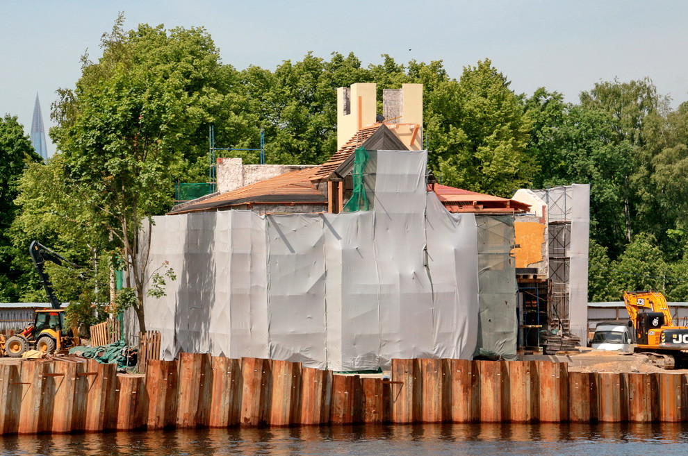 Здание Санкт-Петербургского гребного общества на берегу Малой Невки, признанное региональным памятником, лишилось кровли башенки и пристройки с эллингом. Там ведется реконструкция гребной базы «Знамя».