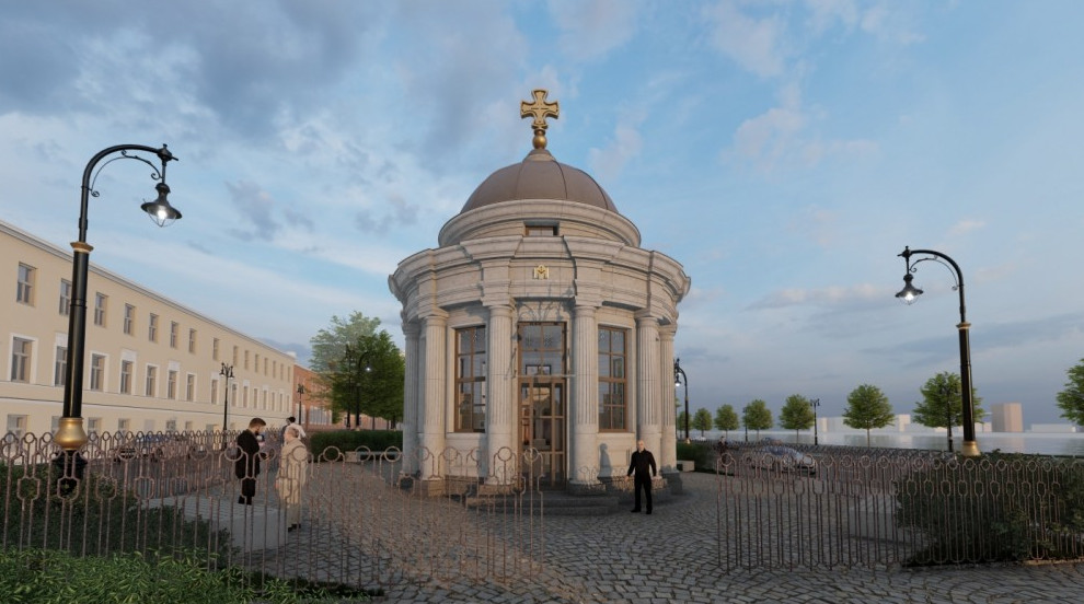 Как стало известно «Канонеру», первым объектом в границах участка станет временная часовня. Проект ее фасадов разработала мастерская Мамошина. «Круглая в плане, часовня решена в стиле классической ротонды. Выполняется из деревянного каркаса. В качестве основания используется монолитная железобетонная плита на щебеночном основании», — пояснили в мастерской. Декор также сделают деревянным.