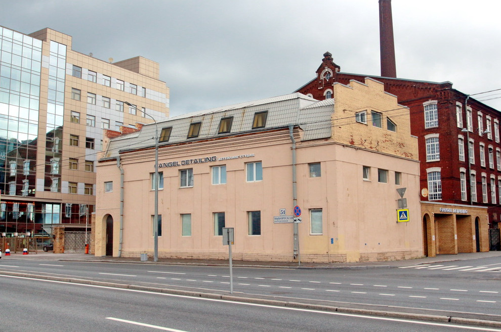 Двухэтажное здание на улице Александра Матросова, 2, на углу с Выборгской набережной было построено до войны (по документам — в 1952 году, но в 1942-м оно уже существовало). Скорее оно, оно относилось к комбинату тканей «Красный маяк». В российское время его надстроили мансардой и добавили одноэтажную пристройку со двора.