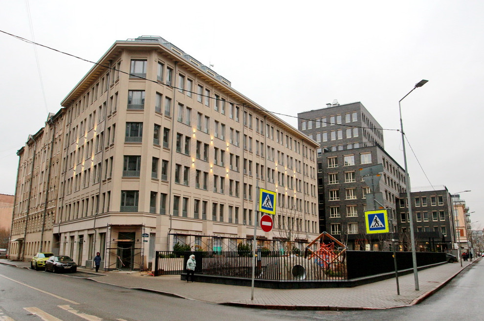На углу Корпусной и Малой Зелениной улиц завершилось строительство жилого дома. Он имеет объемы разного вида: один явно отсылает к исторической архитектуре, а второму будто не хватило времени сделать оформление.