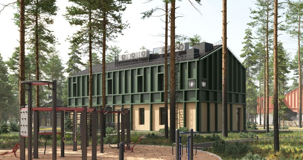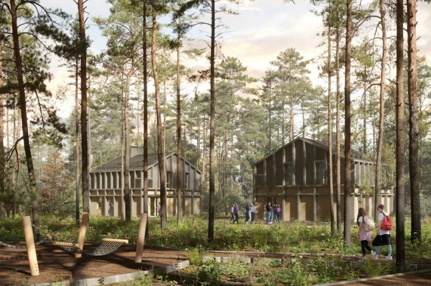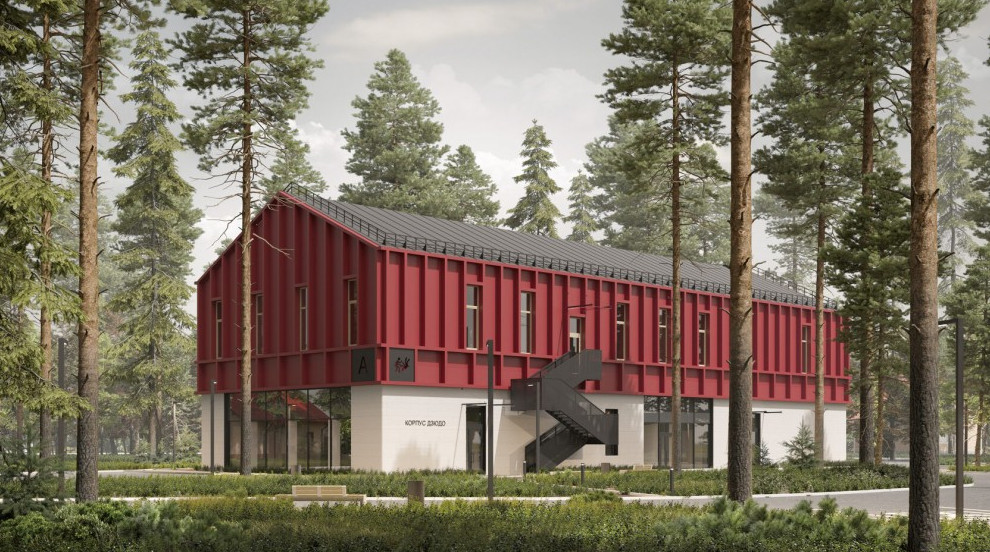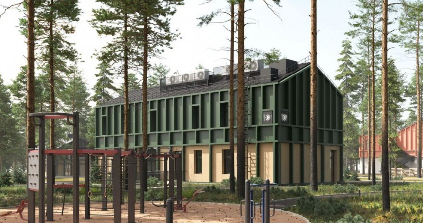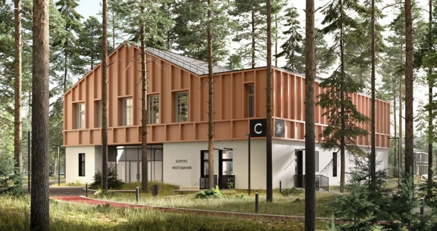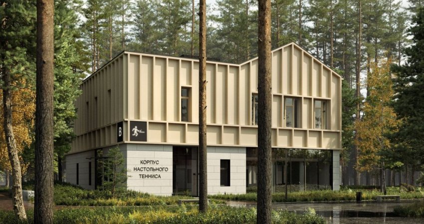 На прошлой неделе на архитектурной выставке представили проект спортивно-оздоровительной базы. Картинки были на стенде АО «Проектное бюро „Луч“». Здания будут двухэтажными. Второй этаж выполнен в виде конструкции каркасных дачных домов без обшивки.
