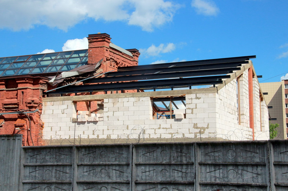 Прошлой весной стало известно, что восточную пристройку (она была покрыта профилированным листом) снесли, а взамен строят новую из газобетона. При этом раскрытый было исторический торец инструментального цеха вновь закладывают. Сейчас новая пристройка полностью готова.