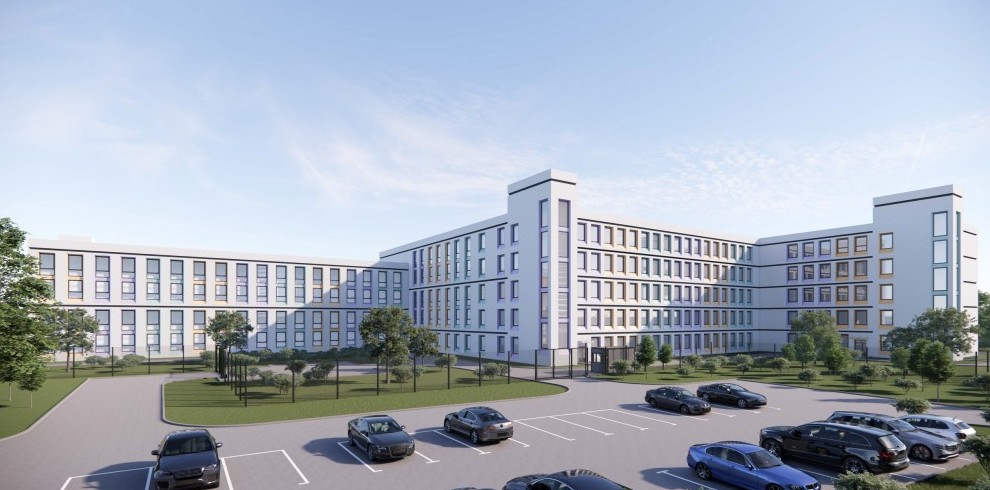 «Основным стилистическим приемом является визуально выступающий центральный блок, выполненный из серого облицовочного кирпича и витражного остекления, который контрастирует с остальными блоками, выполненными из тонкослойной фасадной штукатурки белого цвета», — пояснили в КГА.