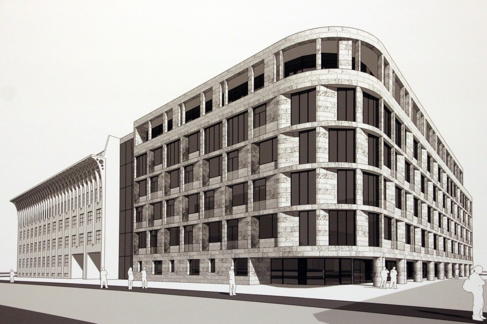 В реальности там стали строить дом с нескругленными углами. Как пояснил КГА, реализуемый дом возводится по проекту ООО «ДБА-группа», выполненному по заказу ООО «Аструм» (какое отношение «Аструм» имеет к объекту, не уточняется). Описывать новую архитектуру ведомство не стало, уточнив лишь, что «фасады решены в теплых песочно-серых оттенках с применением натурального камня и стеклофибробетона». Сейчас здание в конструкциях готово, ведется отделка.
