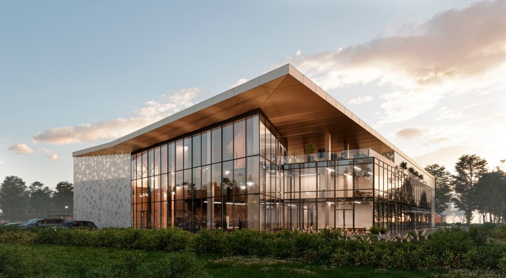 «В здании появятся крытые корты, тренировочные залы, зоны для разминки, зал общей физической подготовки, а также кофейня и другие административные и вспомогательные помещения. На третьем этаже расположена видовая терраса для отдыха посетителей. На территории предусмотрены открытые корты», — рассказали в КГА. В отделке фасадов планируется применить металлические панели и витражи.