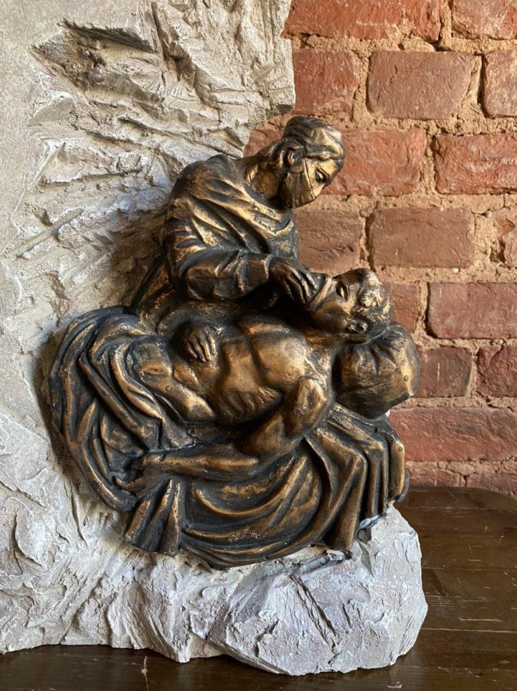 Евгений Павлюченко - третий финалист, скульптор монументалист из Волгограда. Его проект – как раз памятник, в полном смысле этого слова и называется «Камень с бронзой». Скульптор изобразил доктора, оказывающего помощь больному, подключенному к аппарату ИВЛ.