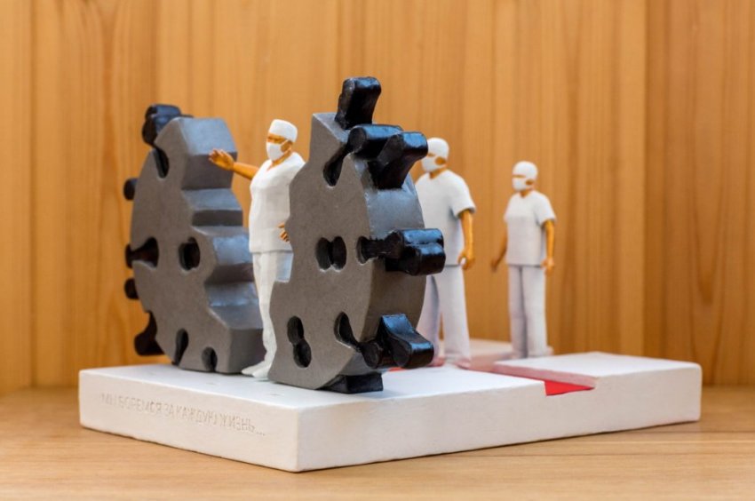 Второй проект – «Три врача» - принадлежит жителю Нижнего Новгорода Дмитрию Пермякову. Дмитрий архитектор и честно признался, что не ожидал победы («…в проекте было больше геометрии, чем пластики»). Тем не менее, жюри отметило именно это решение, также изображающее врачей, идущих бороться за наши с вами жизни. Им предстоит вступить в поединок с жесткой механистичной силой, которая, как эта "шестеренка", похожая на коронавирус, перемалывает здоровье людей и их надежды на будущее.