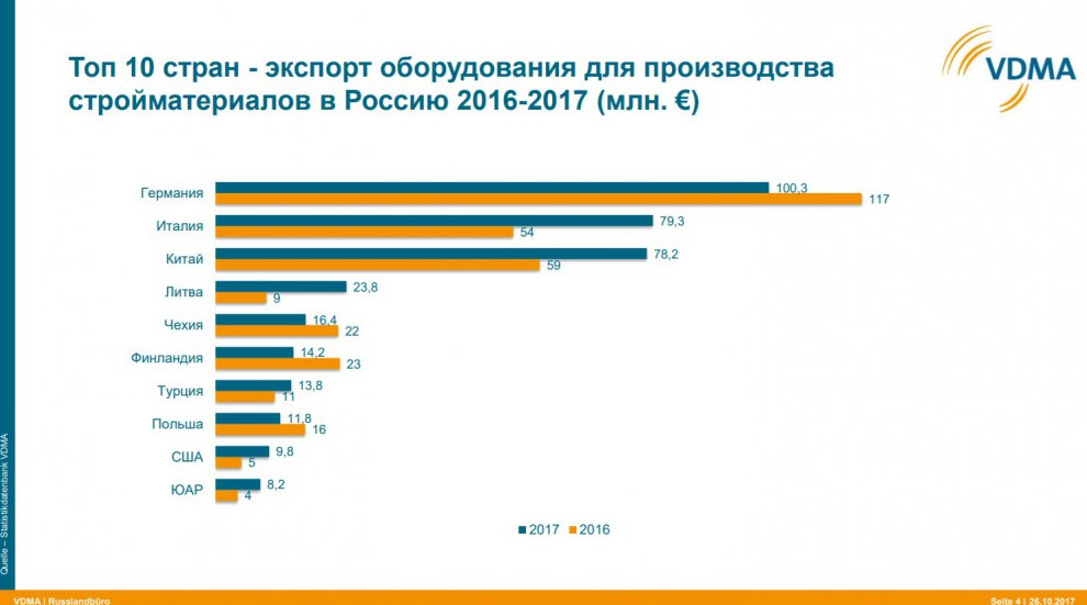 — Если смотреть по всем отраслям машиностроения, то наш союз объединяет 3 200 членов. Это компании, которые имеют свое производство, и в основном они расположены в Германии, однако 10% приходится на другие страны Евросоюза. Более 300-т компаний работает в области строительной техники или оборудования для производства строительных материалов.