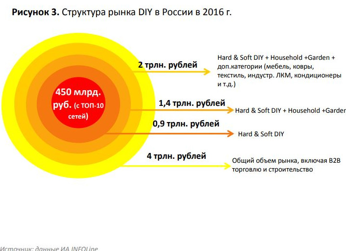 Если смотреть на положение российских девелоперов в 2015–2016 годах, то четко видна тенденция по изменению структуры ассортимента. Доля строительных и отделочных материалов сокращалась, так как российские компании проигрывали конкурентную борьбу международным сетям, особенно лидеру «Леруа Мерлен». А освободившееся место занимали товары для дома, сада, бани и т. д. Это расширение ассортимента позволило ретейлерам хоть как-то увеличить средний чек. Если проанализировать 40 крупнейших сетей DIY России с совокупной долей на рынке до 50 %, то 17 из них расширили свой ассортимент именно таким образом.