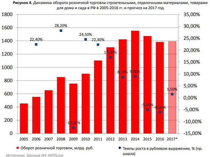 — Приведу статистические данные от INFOLine. Крупномасштабные ремонты в 2016 году в нашей стране сократились более чем на 10 %, то есть значительно меньшее число людей строят индивидуальные дома и делают крупные ремонты в квартирах с нуля. Потребление же материалов для мелких отделочных работ падало менее активно.